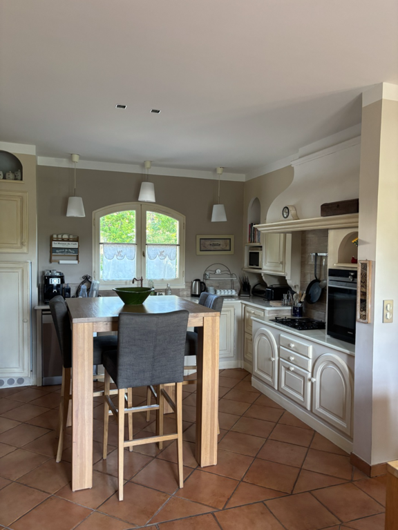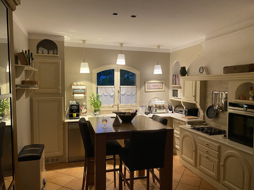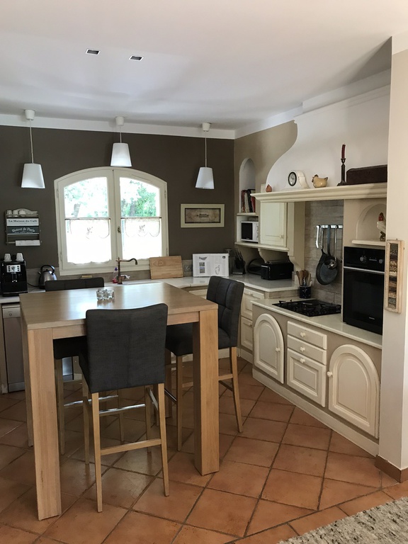 Die voll ausgestattete Landhausküche lässt keine Wünsche offen: Spülmaschine, Mikrowelle, Kühlschrank, Gefrierschrank, Gasherd, Küchenmaschine, Entsafter und mehr stehen bereit, um gemeinsam die köstliche Cuisine francaise nachzukochen. Oder aber am Morgen am Hochtisch einen frischen Croissant in den Kaffee zu tunken oder den Apéro zu genießen.